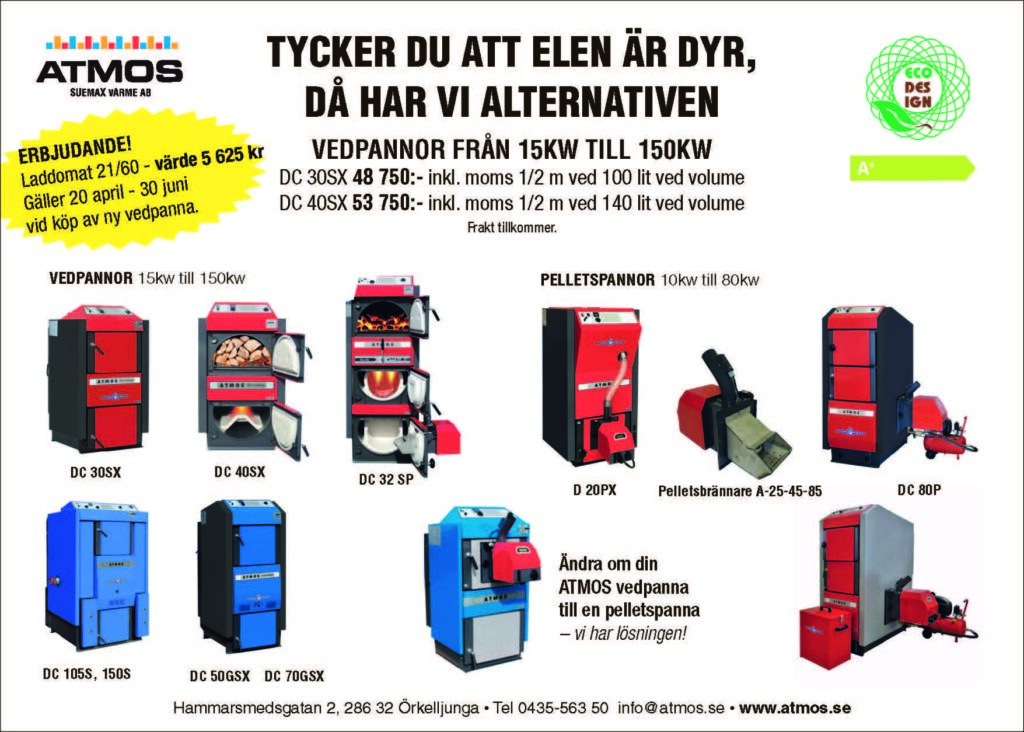 Vi på Atmos Suemax Värme AB har mer än 20 års erfarenhet av att leverera trygg och säker utrustning för bioenergieldning till i stort sett de flesta behov. Modern bioenergi luktar inte, är bekväm att hantera och kanske det bästa av allt, det ger dig pengar över till någonting annat. Oavsett om du väljer ved, pellets eller briketter skall du veta att du dragit ditt strå till stacken för en renare och hållbarare värld. Vi på Atmos har din nya ved- och pelletspanna.